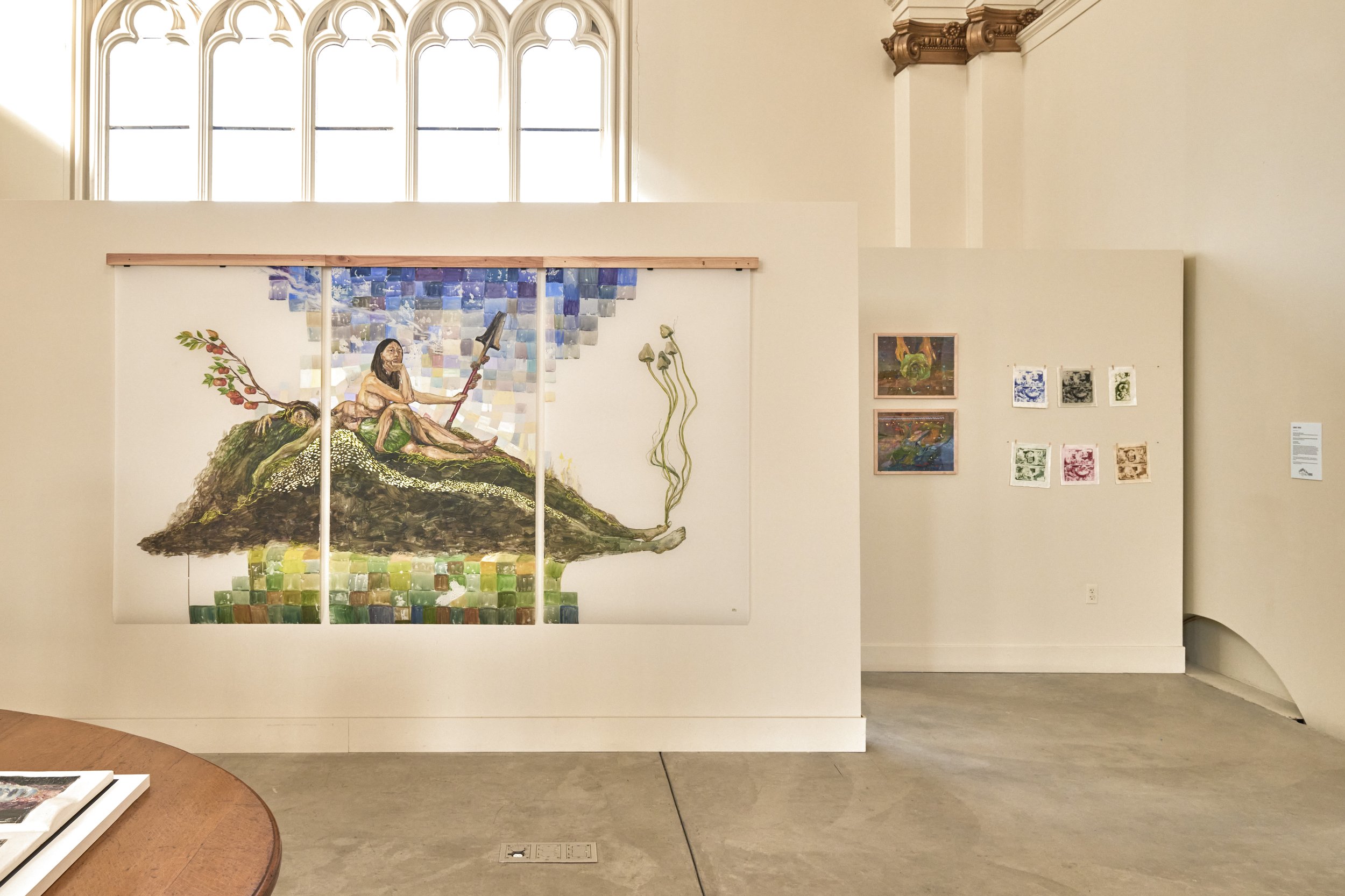 Yield, 2023. 109” x 51”. Gouache on drafting film. Installed at the Yerba Buena Center for the Arts (San Francisco, CA). Photography by Jenna Garrett.